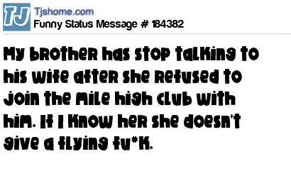 X is My brother has stop talking to his wife after she refused to join the mile high club with him. If I know her she doesn't give a flying fu*k.
