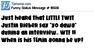 X just heard that LITTLE TWIT Justin Bieber say "yo dawg" during an interview.. WTF !! When is his 15min gonna be up?