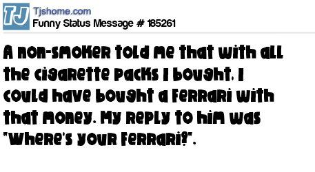 X is A non-smoker told me that with all the cigarette packs I bought, I could have bought a Ferrari with that money. My reply to him was "Where's your Ferrari?".