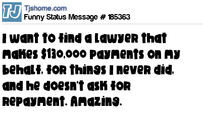 X says I want to find a lawyer that makes $130,000 payments on my behalf, for things I never did, and he doesn't ask for repayment. Amazing.