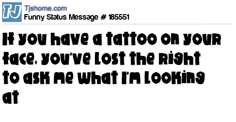 - # 147948 If you have a tattoo on your face, you've lost the right to ask me what I'm looking at.