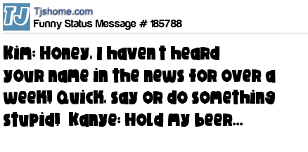 X says Kim: Honey, I haven’t heard your name in the news for over a week! Quick, say or do something stupid! Kanye: Hold my beer...