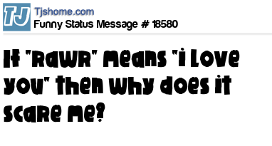 - # 114104 "Rawr" does NOT mean "I love you" in dinosaur. You ever seen Jurassic Park? It means, I'm going to eat you