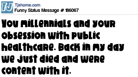 - # 177881 You millennials and your obsession with public healthcare. Back in my day we just died