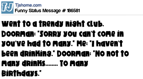 X is Went to a trendy night club. Doorman: "Sorry you can't come in you've had to many." Me: "I haven't been drinking." Doorman: "No not to many drinks........ To many Birthdays."