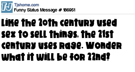 X says Like the 20th century used sex to sell things, the 21st century uses rage. Wonder what it will be for 22nd?
