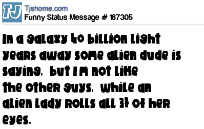 X says In a galaxy 40 billion light years away some alien dude is saying, “but I’m not like the other guys,” while an alien lady rolls all 37 of her eyes.