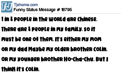 - # 32945 Apparently, 1 in 5 people in the world are Chinese. And there are 5 people in my family, so it must be one of them. It's either my mum or my dad. Or my older brother Colin. Or my younger brother Ho-Chan-Chu. But I think it's Colin.