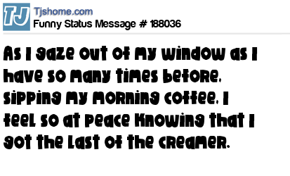 X says As I gaze out of my window as I have so many times before, sipping my morning coffee, I feel so at peace knowing that I got the last of the creamer.