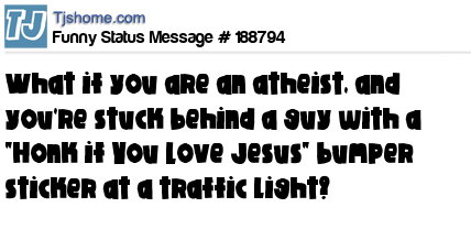 - # 202849 I’ve often wondered what an atheist would do if he was stuck behind a car that wasn’t moving at a green light and had a bumper sticker on it that said "Honk if you love Jesus."