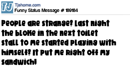 X is People are strange? Last night the bloke in the next toilet stall to me started playing with himself? It put me right off my sandwich!