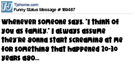 X says Whenever someone says, "I think of you as family," I always assume they're gonna start screaming at me for something that happened 20-30 years ago...