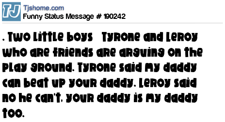 X is . Two little boys Tyrone and Leroy who are friends are arguing on the play ground. Tyrone said my daddy can beat up your daddy. Leroy said no he can't, your daddy is my daddy too.