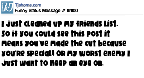 - # 190433 Just cleaned up my friends list, so if you can see this post it means you've made the cut because your special!....or my worst enemy I just want to keep an eye on.