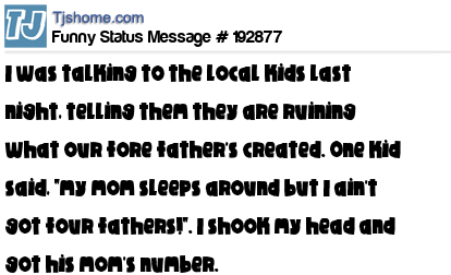 X says I was talking to the local kids last night, telling them they are ruining what our fore father's created. One kid said, "my mom sleeps around but I ain't got four fathers!". I shook my head and got his mom's number.