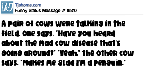 - # 45274 A pair of cows were talking in the field. One says, "Have you heard about the mad cow disease that's going around?" "Yeah," the other cow says. "Makes me glad I'm a penguin."