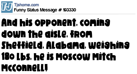 X is And his opponent, coming down the aisle, from Sheffield, Alabama, weighing 180 lbs, he is Moscow Mitch McConnell!