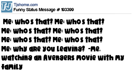 X says Me: who’s that? Me: who’s that? Me: who’s that? Me: who’s that? Me: who’s that? Me: who’s that? Me: why are you leaving? -me, watching an Avengers movie with my family