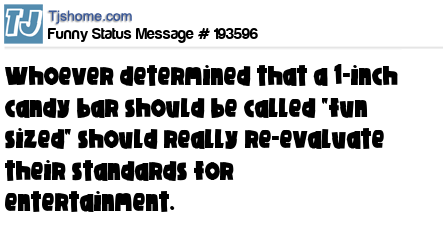 - # 139331 Halloween is just over a week away now. When it comes to candy bars, the term fun-sized is misleading. There is nothing fun about your candy bar being 1/8 the size of a regular bar. You should call them what they are: “disappointment-sized.”