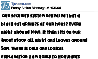 X says Our security system revealed that a black cat arrives at our house every night around 10pm. It then sits on our front stoop all night and leaves around 5am. There is only one logical explanation: I am going to Hogwarts soon.