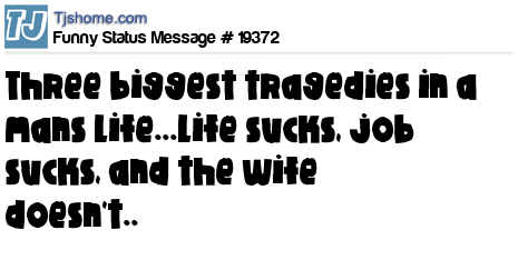 X is Three biggest tragedies in a mans life...Life sucks, job sucks, and the wife doesn't..
