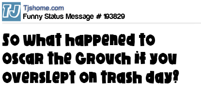 - # 190603 I have all the world's knowledge at the very tips of my fingers where I can find the answers to life's most perplexing questions! and here I am googleing What did Oscar the Grouch do if he overslept on trash day?