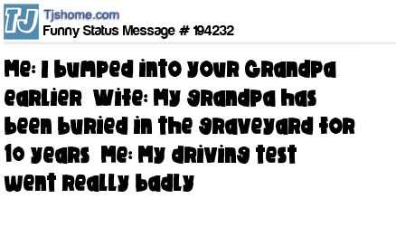 X says Me: I bumped into your Grandpa earlier Wife: My grandpa has been buried in the graveyard for 10 years Me: My driving test went really badly