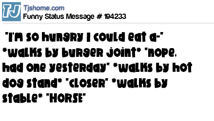 X says "I'm so hungry I could eat a-" *walks by burger joint* "nope, had one yesterday" *walks by hot dog stand* "closer" *walks by stable* "HORSE"