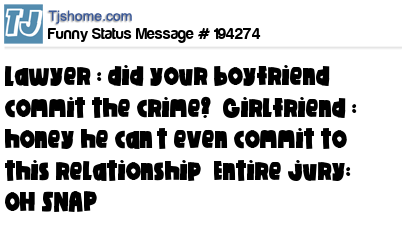 X says Lawyer : did your boyfriend commit the crime? Girlfriend : honey he can’t even commit to this relationship Entire jury: OH SNAP