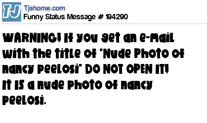 X says WARNING! If you get an e-mail with the title of "Nude Photo of nancy peelosi" DO NOT OPEN IT! It IS a nude photo of nancy peelosi.