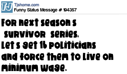 - # 173652 For next season's "Survivor" series, let's get 16 politicians and force them to live on minimum wage.