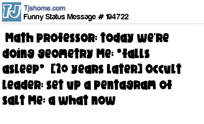 X says Math professor: today we're doing geometry Me: *falls asleep* [20 years later] Occult leader: set up a pentagram of salt Me: a what now