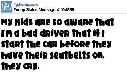 X says My kids are so aware that I'm a bad driver that if I start the car before they have their seatbelts on, they cry.