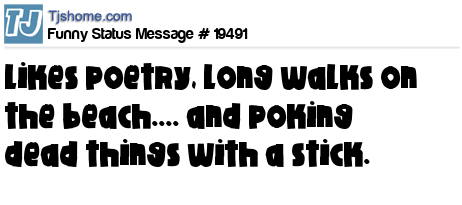 - # 80987 My dating profile is:- Likes poetry, long romantic walks in the woods and poking dead thing's with a stick.