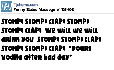 X says STOMP! STOMP! CLAP! STOMP! STOMP! CLAP! We will we will drink you STOMP! STOMP! CLAP! STOMP! STOMP! CLAP! *pours vodka after bad day*