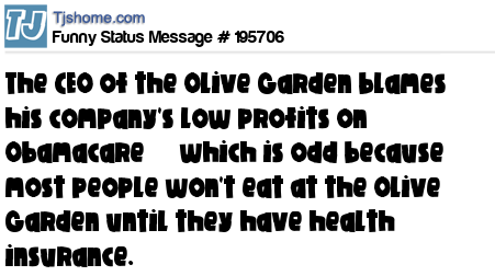 X says The CEO of the Olive Garden blames his company's low profits on Obamacare — which is odd because most people won't eat at the Olive Garden until they have health insurance.