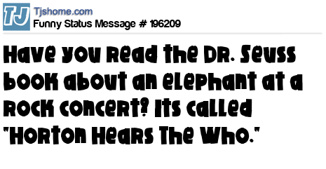 X says Have you read the Dr. Seuss book about an elephant at a rock concert? Its called "Horton Hears The Who."