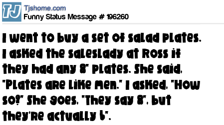 X says I went to buy a set of salad plates. I asked the saleslady at Ross if they had any 8" plates. She said, "Plates are like men." I asked, "How so?" She goes, "They say 8", but they're actually 6".