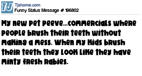 X My new pet peeve...commercials where people brush their teeth without making a mess. When my kids brush their teeth they look like they have minty fresh rabies.