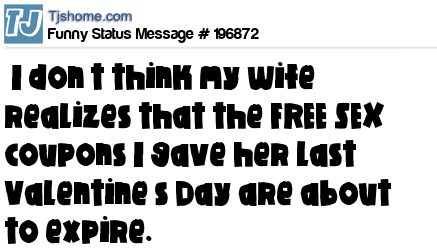 X says I don’t think my wife realizes that the FREE SEX coupons I gave her last Valentine’s Day are about to expire.