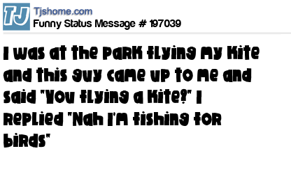 - # 49562 So I was at the park flying my kite and this random guy came up to me and said "You flying a kite?" I replied "Nah I'm fishing for birds"