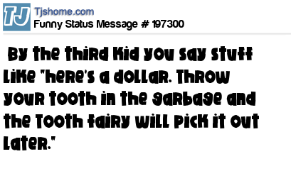 X says By the third kid you say stuff like "here's a dollar. Throw your tooth in the garbage and the Tooth fairy will pick it out later."