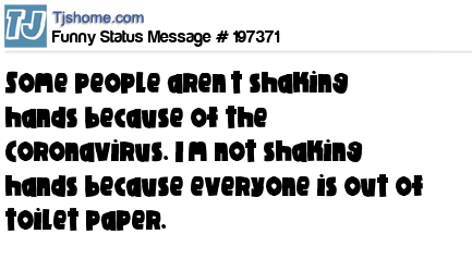 - # 197382 Some people aren't shaking hands because of the Corona virus. I'm not shaking hands because everyone's almost out of toilet paper.