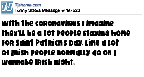 X is With the coronavirus I imagine they'll be a lot people staying home for Saint Patrick's Day, like a lot of Irish people normally do on I wannabe Irish night.
