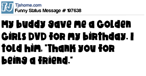 X says My buddy gave me a Golden Girls DVD for my birthday. I told him, "Thank you for being a friend."