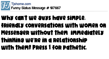 X says Why can't we guys have simple, friendly conversations with women on Messenger without them immediately thinking we're in a relationship with them? Press 1 for pathetic.