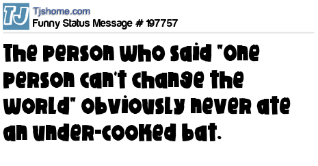 X The person who said "One person can't change the world" obviously never ate an under-cooked bat.
