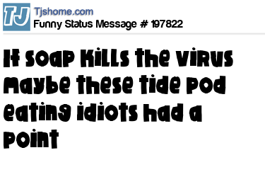 - # 198269 Wonder if those tide pod eaters were on to something if soap kills the Coronavirus?