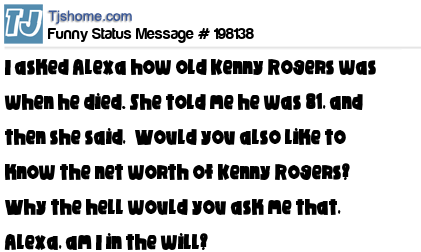 X says I asked Alexa how old Kenny Rogers was when he died. She told me he was 81, and then she said, “Would you also like to know the net worth of Kenny Rogers?” Why the hell would you ask me that, Alexa, am I in the will?