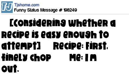 X says [Considering whether a recipe is easy enough to attempt] Recipe: First, finely chop— Me: I’m out.